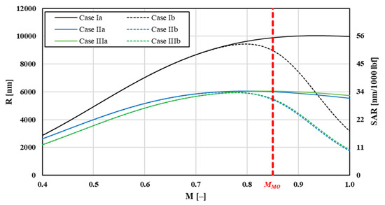 Figure 3 as I-a (no wave drag) and I-b (with wave drag) predictably result in longest computed ranges. However, that result is not realistic. Maximum range (with full fuel load) for the fictitious transport airplane modeled here would amount to over 10,000 NAM, which is about 65% longer than maximum of about 6000 NAM of a real B767-300ER aircraft. Additionally, the SAR of 56 NAM/1000 lb fuel is unrealistic and closer to values of narrow-body airplanes that cruise at SARs of 50 to 90 NAM/1000 lb fuel [