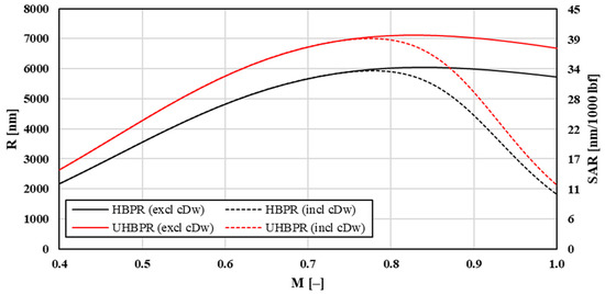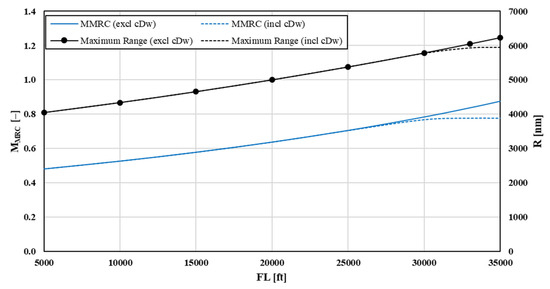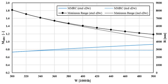 VMRC are nearly identical. If one considers other engines than the P&Ws PW4056 modeled here with Equation (24), a greater BPR would accentuate the trend towards better range performance. The higher the BPR, the higher maximum range at still almost constant