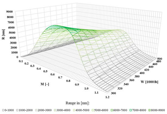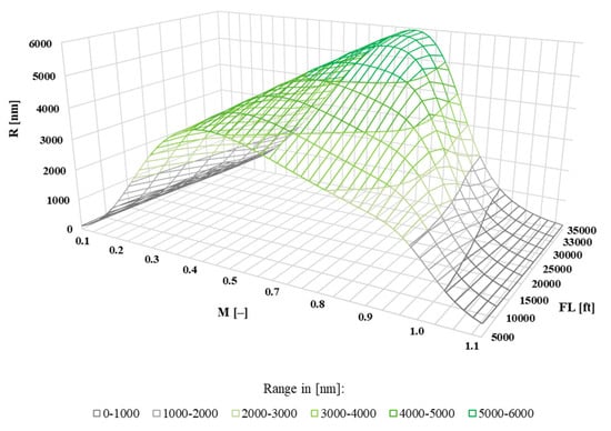 30]. 3D plot illustrating dependance of range on flight Mach number and in-flight weight is presented in