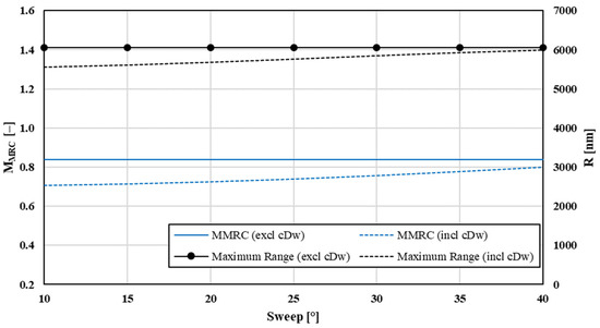 If transonic-flow normal shocks are ignored, the sweep-angle Λ parameter does not change the total drag significantly. Range and maximum cruise range airspeed remain constant in that case, as shown in
