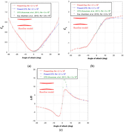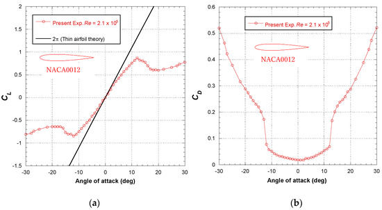 - Ohtake, T.; Nakae, Y.; Motohashi, T. Nonlinearity of the Aerodynamic Characteristics of NACA0012 Aerofoil at Low Reynold Numbers. Trans. Jpn. Soc. Aeronaut. Space Sci. 2007, 55, 439–445. (In Japanese) [Google Scholar]