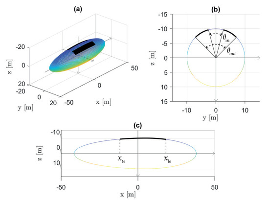 Considering HAA designed for a high-altitude pseudo-satellite (HAPS) mission, keeping the airship in a fixed position with respect to the ground, in the face of reasonably slow-varying (albeit intense) headwind, is performed by adopting an axial-symmetric geometry. As a matter of fact, for that type of mission the envelope geometry is typically based on a solid of revolution. In mathematical terms, these geometries can be assigned based on different modeling approaches [6,16,19,23]. In this work, in consideration of the applications which will be later presented (see Section 4), the low-drag bi-ellipsoidal shape designed by the NPL [19] is adopted, consisting of two semi-ellipsoids jointed at the maximum thickness longitudinal location. For this analytic geometry the envelope is completely defined by the overall length of the envelope L and its fineness ratio , with b minor semi-axis of the ellipsoid. However, it should be remarked that whatever the mathematical modeling, once the geometry of a solid of revolution is assigned, the corresponding features required for aerostatic, power capture, and structural integrity computations can be uniquely evaluated—namely, the fineness ratio , envelope volume and area of external surface, area of lateral projection , and position of the buoyancy center .