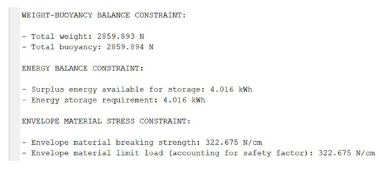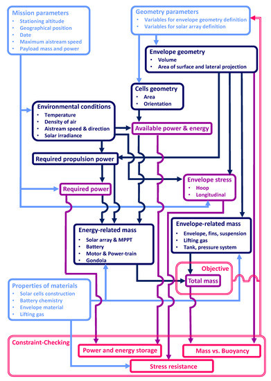 Further assumptions in the first guess involve the general arrangement of the airship envelope and a starting geometrical sizing. For an HAA based on solar cells, this step corresponds also to the definition of the surface of solar arrays. Merged with the time schedule, geographical location on Earth, and target altitude (or altitude range), this directly allows for the estimation of the ideal captured solar radiation. Combining geometrical information and mission schedule requirements—the latter especially with the aim of estimating the inside/outside pressure gradient, thus allowing for the assessment of the required thickness of the envelope material—the weight break-down of the entire airship can be computed. This allows for the estimation of the overall energy and power requirements. In turn, the first guess sizing allows for the triggering of the iterative procedure mentioned above, where criteria corresponding to the three drivers just introduced need to be simultaneously verified for an acceptable sizing.
