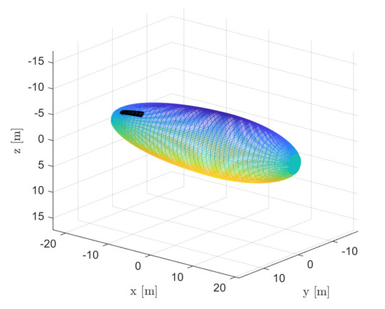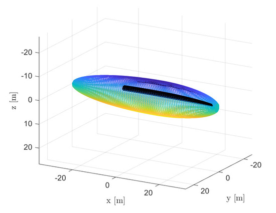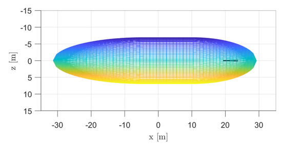 where v is the relative airspeed of the airstream with respect to the airship, the density of air at altitude, the volume of the envelope, and the drag coefficient of the airship [12]. To estimate the latter, lumped parameter methods can be deployed, expressing its dependence on the actual geometry as a function of a few integral parameters, such as the fineness ratio [25,26], or it can be estimated with numerical codes, based on a discretization of the hull shape. The axial-symmetric envelope can be considered aligned with the airstream, thus working at a null angle of attack with respect to it. Considering a null dynamic lift component, the value of the lift coefficient is correspondingly null, and the drag coefficient value needed for the computation is just one value (i.e., that for a null angle of attack), instead of a function.