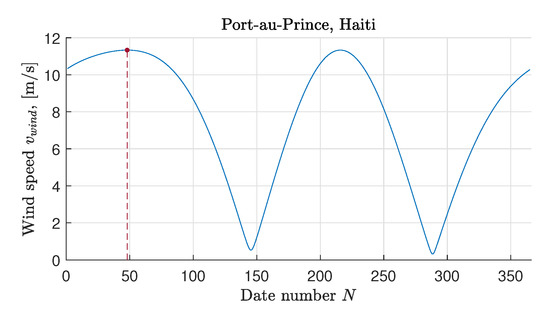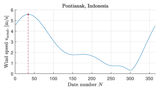 Considering a null relative motion of the airship with respect to the ground, the relative airspeed v in Equation (1) can be estimated based on that of the airstream only. The latter is computed in this research according to the Horizontal Wind Model (HWM) [4,27], where the components of the airstream average velocity vector are assigned up to an altitude of 500 km as a function of geographic location (coordinates), altitude, day of the year, solar local time, and geomagnetic activity.