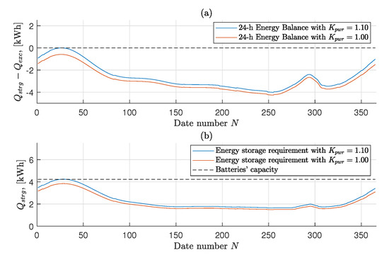 Having defined the required mass of the batteries, or in general of the energy storage system, in order to collect sufficient energy for continuous operation, the closed-cycle model for the 24-h energy balance of the airship can now be completed, by also evaluating the surplus energy available for storage during daytime. Not all the excess power produced by the solar array is taken into account for the energy balance, but consistently with the concepts just introduced, the actual maximum continuous charge rate of the system is considered. Stated another way, if the power production of the solar array presents a peak that exceeds the charge rate of the system, the latter will limit the energy actually added to the system. As a result, the surplus energy effectively available for storage is given by Equation (27),