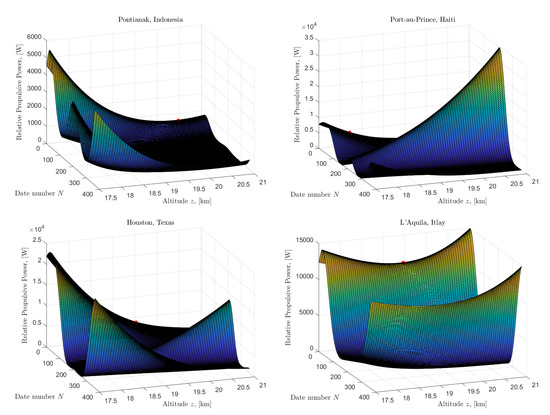 Concerning motion, for an HAA performing a HAPS mission it is typically desirable to stay in a near-fixed position with respect to a point on the ground, in spite of the airstream present at altitude in the stratosphere. In case this requirement is not strict, an optimal energetic strategy can be envisaged, where the airship moves upstream during the day, profiting from the higher solar power available, and drifts downstream during the night. This typically allows for the optimization of the battery mass required for energy storage and reduces the overall weight [2,24]. However, if precise positioning is at a premium, that can be ensured by a proper sizing of the batteries. This more stringent scenario is considered herein. For station keeping, the thrust produced by the propulsion system should balance the aerodynamic drag. Therefore, it is associated with the propulsive power that can be computed according to Equation (1)