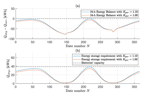 where it is assumed that one will compute the maximum energy which should be stored in the batteries by computing an integral over a day of operations of the difference between the power captured by the solar cells and the power required by the system for work. The term is a binary factor with the function of distinguishing between time instants when the solar array output is sufficient to power the airship from those when it is not; therefore, the contribution of the energy storage system is needed to feed the airship plants. Furthermore, is a safety factor to slightly upscale the whole power system, making it able to cope with peaks in power demand or uncertainties, due for instance to lower-than-expected power generation, unpredictably excessive airstream speeds, or an airship orientation misaligned with respect to the stream direction. A value of 1.1 is assumed [12]. The terms which appear in the denominator in Equation (25) are the discharge efficiency of the energy storage system and the transmission and power switch/step efficiencies, and , respectively, which account for the line losses downstream of the system.