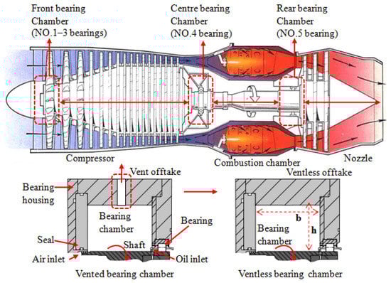 The flow behavior of oil/gas two-phase in the chamber is mainly affected by the internal pressure, chamber structures and size, rotor speed and flow rates of oil/gas. Therein, chamber structures such as geometry and oil return design have important influences on lubricating oil distribution [3,4,5]. At present, there are three bearing chambers in an aero-engine: the bearings (No. 1–3) located in the compressor uses the front bearing chamber together, the bearing (No. 4) near the combustion chamber uses the centre bearing chamber alone, and the bearing (No. 5) located at the nozzle uses the rear bearing chamber alone. The position of the aero-engine bearing chamber and structural diagrams are shown in Figure 1. There are two main types of chamber structures of aero-engines: one is a vented bearing chamber with vent and scavenge offtake [6,7], and the other is the novel ventless bearing chamber with only a single outlet for air and lubricating oil to flow out together [3]. As far as the vented bearing chamber is concerned, air easily entraps lubricating oil from the vent offtake under high rotor speeds, resulting in a decrease in the lubricating oil to the oil/gas separator and the maldistribution of the oil phase. The superheating in areas of missing lubricating oil may lead to coked oil fragments and subsequent combustion [8,9]. The better sealing performance of the ventless bearing chamber eliminates the leakage of oil from the vent offtake, and due to the small pressure drop gradient in the ventless bearing chamber, the flow rate of air in the chamber and the influence of rotating airflow on the distribution of oil are reduced, increasing the gravity of the lubricating oil itself and causing the lubricating oil to flow out from the scavenge off take at the bottom [10,11,12]. However, most of the studies are on the steady motion of oil/gas two-phase in vented bearing chambers, and the studies of unsteady motion in the ventless bearing chambers are scarce. In view of this, it is necessary and important to study the unsteady motion characteristics of oil/gas two-phase in a ventless bearing chamber.