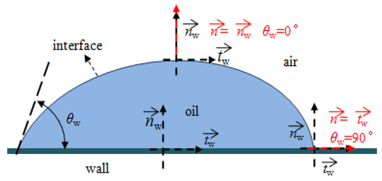 The lubricating oil attached to the wall produces a contact angle with the wall, which will affect the interface curvature of oil phase, as seen in Figure 2. Thus, the actual unit normal vector can be obtained as follows: