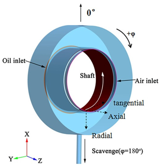 The geometric model of the ventless bearing chamber is shown in Figure 3, which is consistent with that adopted in the experiment by Kurz et al. [3]. It is noted that the circumferential angle is defined as follows: the angle of scavenge offtake is 180°, and the angle is increased in clockwise direction. Air and lubricating oil enter the bearing chamber from the air inlet and oil inlet respectively, and flow out from the scavenge offtake. The inner wall is a slip wall in counterclockwise rotation, and the other walls are fixed non-slip walls. In different directions, positive radial velocities point radially outward from the rotation Z axis, the positive axial velocities are in the direction of the rotation Z axis vector, and positive tangential velocities are based on the right-hand rule using the positive rotation Z axis.