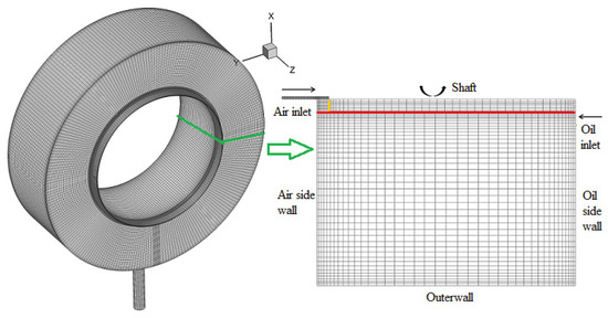 The dimensions and boundary conditions of the bearing chamber are shown in Table 1. The radial height (h) and axial width (b) are the important dimensions of the bearing chamber. The relative size of the bearing chamber is defined by the aspect ratio A to characterize the flow characteristics of oil/gas two-phase under this size of the ventless bearing chamber. The aspect ratio of the ventless bearing chamber is 0.712, and its formula is as follows: