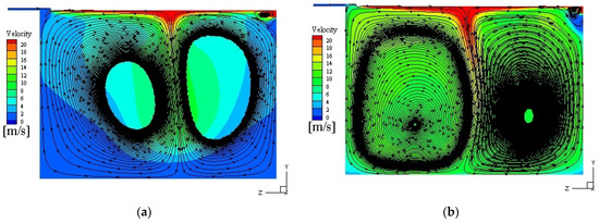 where is the rotational speed of the shaft, is the air inlet velocity; is the Reynolds number of the rotor, and is the Reynolds number of air. For 4.2, it is the rotational speed driving mode with twin vortices in the chamber. For 4.2, it is the sealed air drive mode with only a single vortex.
