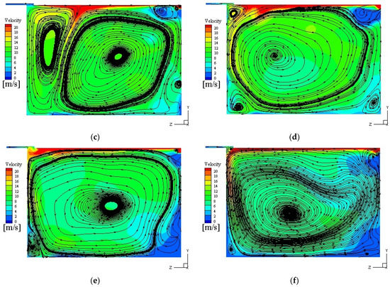 Streamlines and velocity field of oil/gas two-phase in the secondary flow with a cross section of 90° at 10,000 rpm over time: (a) T = 0.027 s; (b) T = 0.198 s; (c) T = 0.363 s; (d) T = 0.393 s; (e) T = 0.528 s; (f) T = 1.117 s.