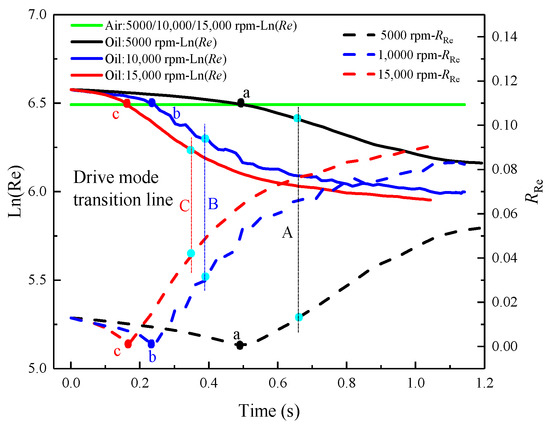 The evolution of the Reynolds number over time is shown in Figure 7. It can be seen from Figure 7 that the oil Reynolds number decreases over time and then levels off under the aspect ratio of 0.712. At the initial stage, the viscosity of lubricating oil after heat transfer is small and the Reynolds number is large due to the high temperature of the chamber. The flow of oil/gas two-phase is mainly affected by the rotor speed, which is called the rotational speed driving mode [15]. Thus, the Reynolds numbers of air and oil are equal for three rotor speeds owing to the shear force of the rotor. Moreover, the variation range of the natural log-Reynolds number of oil is symmetrically up and down based on the natural log-Reynolds number of air before the driving mode transition points (A, B, and C). Then, the natural log-Reynolds number of oil decreases over time after points A, B, and C. The viscosity of oil increases with decreasing average temperature in the chamber. Therefore, it is more susceptible to the impact of the rotor shear force compared with air and forms a single vortex dominated by lubricating oil. Here, the Reynolds ratio of two phases can be used as the criterion of the driving mode, which is as follows: