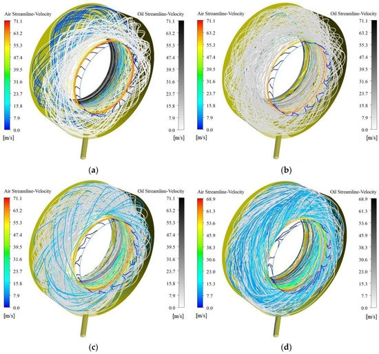 The oil/gas streamlines of the rotational speed driving mode at 10,000 rpm: (a) t = 0.056 s; (b) t = 0.198 s; (c) t = 0.213 s; (d) t = 0.303 s.