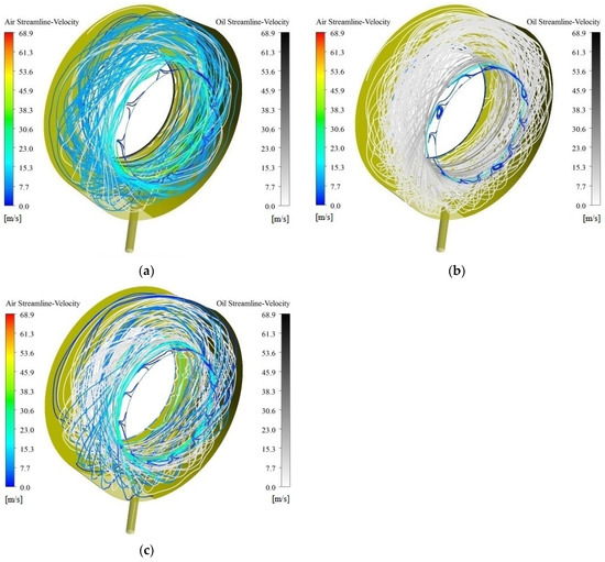 The streamlines of oil/gas two-phase by lubricating oil driving mode at 10,000 rpm: (a) t = 0.393 s; (b) t = 0.588 s; (c) t = 1.137 s.