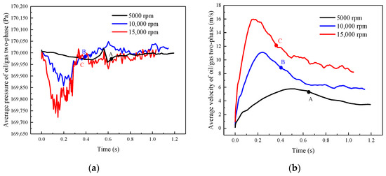In the transformation of driving mode, the average velocity and the average pressure values of oil/gas two-phase obviously change. Figure 11 shows the relationship between average pressure (a) and average velocity (b) of oil/gas two-phase at different rotor speeds.