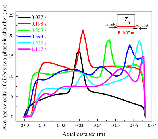 Figure 12 shows the axial variation of average velocity of oil/gas two-phase on the 0.07 m radius section at 10,000 rpm. The radius is 0.07 m, and it is close to the rotor wall under the aspect ratio of 0.712. As time goes on, the region with relatively large velocity of oil/gas two-phase at the section tends to the air inlet side. As shown in Figure 12, the average velocity presents asymmetrical distribution of high in the middle and low on both sides at time ranges from 0.027 to 0.198 s, which is consistent with the distribution of the twin vortices in Figure 6b. At the beginning, the velocity of the oil/gas is larger at 1/2b in the axial direction. The peak of velocity shifts to the air inlet side over time and gradually forms a single vortex, which is consistent with the evolution from the rotational speed driving mode to the oil driving mode. The peak of the velocity also firstly increases, then decreases, and then stabilizes. After reaching 0.393 s, the peak is at the inlet side, and the motion of oil/gas two-phase in the bearing chamber is integrated into a single vortex circulation.