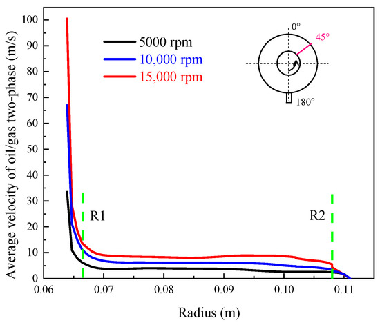 Radial velocity of oil/gas at different rotor speeds with the aspect ratio.