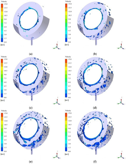 Distributions (α = 0.25) and velocity fields of oil phase at 10,000 rpm over time: (a) t = 0.243 s; (b) t = 0.448 s; (c) T = 0.648 s; (d) t = 0.847 s; (e) t = 1.057 s; (f) t = 1.142 s.