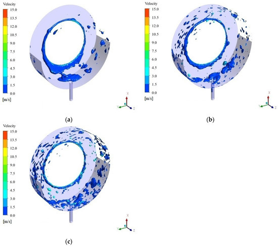 Distributions (α = 0.25) and velocity fields at different rotor speeds in steady state: (a) n = 5000 rpm; (b) n = 10,000 rpm; (c) n = 15,000 rpm.
