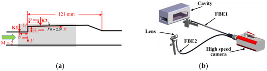 Figure 1 provides a diagram of the combustor and the associated data acquisition system. In this apparatus, a cavity with a depth of 11 mm and a length of 121 mm was connected to the downstream of the isolator. There were two fuel injection positions, as shown in Figure 1. The first injector (K1) was located at the isolator 15 mm from the cavity step; the second injector (K2) was situated on the top wall of the cavity at an axial position 25 mm from the cavity step. Hydrogen was injected vertically into the airflow by ten holes (each with a diameter of 1 mm) at specific positions according to the experimental requirements. Three quartz windows were installed to allow chemiluminescence images to be captured: two on the side walls and one on the bottom of the cavity. More detailed descriptions of the experimental system can be found in prior publications [30,31]. As shown in Figure 1b, the data acquisition system comprised a high-speed camera (IX i-speed 720, Essex, UK) and two fiber-based endoscopes (FBEs) combined with two 50 mm f/2.8 Nikon prime lenses (Tokyo, Japan), allowing simultaneous observations of the combustion process in the cavity from two perspectives. The FBE1 faced the side wall quartz window; the FBE2 faced the window on the base of the apparatus. Chemiluminescence images of the combustion products were captured at a framerate of 20 kHz. The field of view of FBE1 was limited to the region indicated by dark shading in Figure 1a to ensure the frame rate. The parameters applied during the experimental trials are summarized in Table 1.