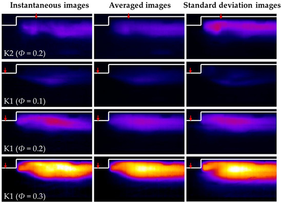 In accordance with the research of Schefer et al. [32,33], the chemiluminescence signal of hydrogen–air flame mainly comes from H2O*, which is generated in an exothermic process; therefore, the chemiluminescence signal here is used to reflect heat release. Figure 2 shows the instantaneous, averaged and standard deviation of side-view flame chemiluminescence images acquired under different conditions. From both the instantaneous and averaged images, it is evident that the flame zone was located within the cavity in each trial. In the case of Φ = 0.2, the intensity of the averaged image acquired with hydrogen injected from the upstream injector was greater than that acquired with the injector inside the cavity. This result indicates that the hydrogen underwent more vigorous combustion when injected from the upstream position at a given equivalence ratio. This same phenomenon was also reported by Tian et al. [29] and was attributed to improved fuel–air mixing [30]. The standard deviation images show the variation in the chemiluminescence as a function of spatial positions, which are indicative of regions of heat release fluctuations. As seen, a uniform degree of variation in chemiluminescence signals (and presumably heat release) occurred within the cavity.