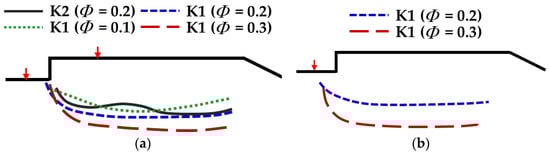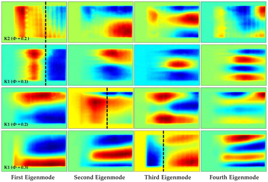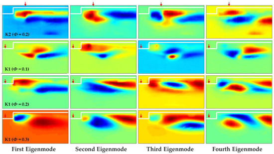 A similar effect was also observed in the POD modes obtained from FBE2. In Figure 6, the distribution is seen to have separated structures along the mainstream flow direction (as indicated by the black dotted lines) in conjunction with the first mode at Φ = 0.2 using K2 and Φ = 0.1 using K1. In contrast, increasing Φ to 0.2 and 0.3 with the K1 injector induced the separated structures along the mainstream flow direction appearing in the second and third modes, respectively. With the reduced effect of the shock waves (i.e., Φ = 0.2 for K2 and Φ = 0.1 for K1), the flow and flame stabilization characteristics inside the cavity became closer to those previously reported for a non-reactive supersonic crossflow over a cavity [34]. At a relatively large length-to-depth ratio, this crossflow was found to exhibit two recirculation zones, one of which was located near the leading edge inside the cavity while the other was situated near the ramp as performed in [34] and summarized by Ben-Yakar et al. [17].