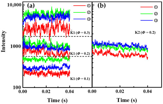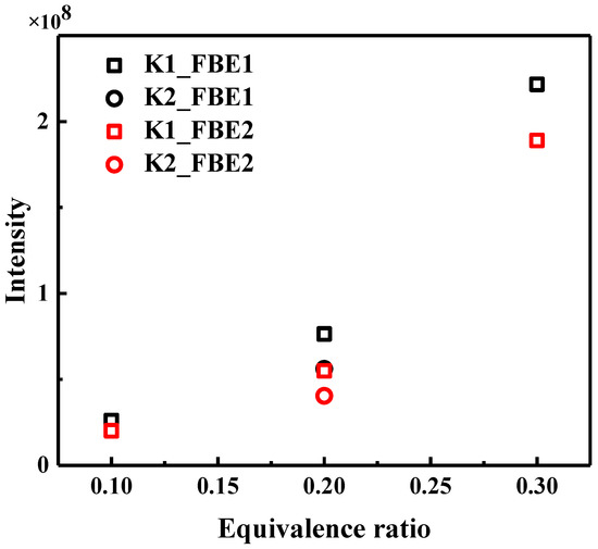 Figure 4 provides data regarding the overall flame chemiluminescence intensity values obtained from 2000 images for each trial. It is evident that the intensity values obtained from FBE1 increased along with Φ. In addition, at Φ = 0.2, the intensity obtained using injector K1 was greater than that from K2. As strong shocks were generated from the K1 injector accompanied by heat release, the combustion proceeded in association with a lower mainstream velocity and enhanced fuel–air mixing. The heat release thus became more intense. The data obtained from FBE2 exhibit a similar trend to that from FBE1.