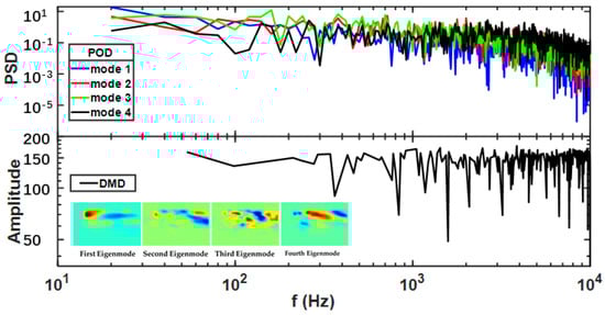 Figure 7 shows the FFTs of the primary POD modes and the DMD power spectrum for hydrogen injected from the K1 injector with Φ = 0.3. No dominant frequency and coherent structures are observed from the PSD and DMD mode distributions. The frequency spectra exhibit a broad distribution. Similarly, the other three cases investigated in this work did not generate a dominant frequency, suggesting that any periodic vortex shedding or acoustic modes did not couple with the reaction. The results are also consistent with the cavity surface pressure measurements in our previous works [29,40]. Conversely, the dominant frequencies associated with supersonic combustion generally appear in cavities with low length-to-depth ratios, as shown in Table 3, and are concentrated in the frequency range of 5–500 Hz [11,12,18,20,21,22]. A few studies have also found higher frequency oscillations in the kHz range [12,23], which were primarily attributed to the so-called thermal choke.