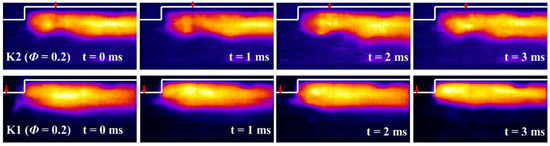The temporal variations of the flame demonstrated the instantaneous fluctuations of both the flame structure and intensity and Figure 8 summarizes the changes in the flames obtained using the K1 and K2 injectors for Φ = 0.2 obtained from FBE1. Interestingly, these two sequences of images show completely different structures. In the case of the K1 injector, the shear layer was relatively smooth, whereas the K2 injector generated a highly distorted shear layer and the effect of the jet on the flame structure was remarkable. As an example, a recirculation zone was formed near the leading edge of the cavity upstream of the K2 injector. This leading edge functioned as a step and was followed by transverse injection that created a large recirculation area with hot gases serving as a continuous ignition source [17].