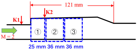 Scramjet engines are promising candidates for efficient air-breathing propulsion at high flight Mach numbers; however, it is challenging to achieve flame stabilization and efficient combustion in such engines because the residence time of the flow in the combustor is on the order of milliseconds [1,2,3,4]. To resolve this problem, a cavity flame holder has been proposed as a means of achieving robust flame holding and stabilization. Huellantel et al. [5] first demonstrated the feasibility of utilizing a flameholding cavity structure in conjunction with supersonic flow in the 1950s. Following this initial work, various aspects of cavity-based supersonic combustors were investigated, such as flame stabilization modes [2,6,7,8,9,10,11,12,13,14,15,16] and oscillation characteristics [11,12,17,18,19,20,21,22,23,24,25]. The simplified structure, improved flameholding characteristics and lower total pressure losses of cavity-based supersonic combustors have resulted in the application of these units to supersonic combustion scramjet engines.