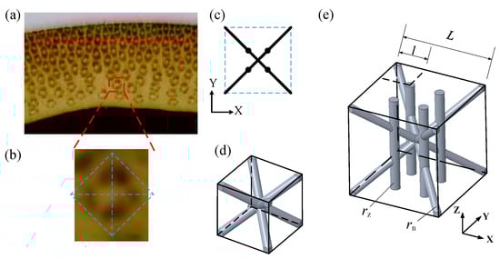 Many studies have shown that bamboo has good performance in resisting axial deformation and energy absorption [,,]. Therefore, in order to improve the capacity of the footpad to resist impact deformation in a certain direction while ensuring the capacity of energy absorption, bamboo is taken as a design reference. According to the vascular structure of bamboo, a lattice cell configuration with four inner reinforced rods in the Z direction, namely BCC4IZ, is proposed. Firstly, the structure of a single vascular bundle is obtained from the section of bamboo (Figure 1a). Then, the single vascular bundle and surrounding tissues are considered as a unit (Figure 1b). In the unit, the four phloem tissues of the vascular bundle structure are arranged in a diamond or rectangle shape and are connected by surrounding tissues. Inspired by this, a bionic 2D XY section, as shown in Figure 1c, is abstracted. On the other hand, the BCC cell configuration (Figure 1d) is used to simulate the tissue around the vascular bundle to disperse the load between the reinforcing structures and ensure continuity. Finally, combining the layout of the reinforced structure with the BCC configuration, the design of the BCC4IZ lattice structure, as shown in Figure 1e, is obtained, where is the radius of normal rods, is the radius of z rods, L is the length of the lattice cell on a certain edge and l is the position of z rod on that edge. For non-uniform spatial grids, the length of each edge of the lattice cell is different, but on each edge, the value of is a fixed value.
