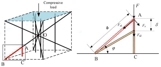 This paper analyzes the effective Young’s modulus of BCC4IZ when and the rods in BCC4IZ have spatial symmetry. Figure 2 exhibits the stress condition of BCC4IZ under compressive load. It is assumed that rod AB and rod AC produce vertical displacement under the action of force F. Suppose the axial force and tangential force on the rod AB are and , and the axial force on the rod AC is . The relationship between the forces is shown in (1)