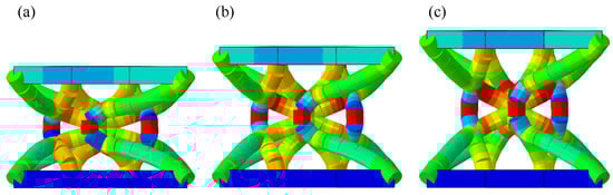 The deformation of a unit cell with different loads. (a) 1 t; (b) 0.8 t; (c) 0.6 t.