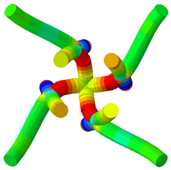 At the end of the impact process, the deformation of a unit cell under three loads are shown in Figure 5. With the increase of the load, the deformation of the unit cell also increases, but the deformation trend is nearly identical. The main deformation of the rods is bending, which occurs not only in the vertical plane but also in the horizontal plane, as shown in Figure 6.