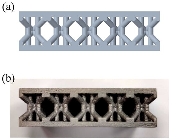 The specimen of BCC4IZ was manufactured by the SLM method of additive manufacturing, as displayed in Figure 7. The material of the specimen is , which is one of the most common metal additive manufacturing materials. There are 15 lattice cells in the specimen and the parameters of BCC4IZ are as follows: , mm, and . BCC4IZ is self-supporting, and there is no internal support inside the specimen. The manufacturing quality of the specimen is excellent and correctly reflects the design characteristics of BCC4IZ, which proves that the novel lattice configuration can be manufactured.