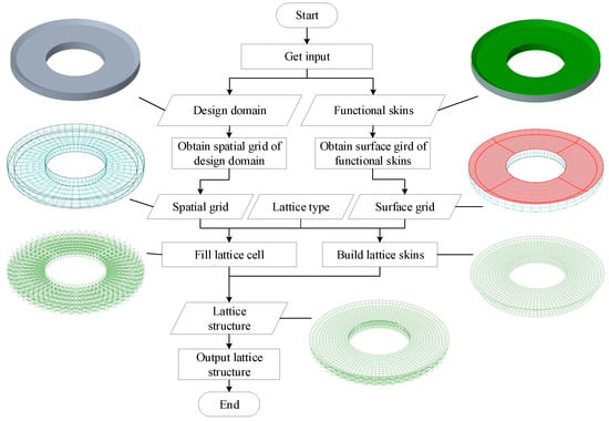 The inputs of this method are the spatial design domain and functional surfaces of the design structure. The spatial design domain is the area where the lattice structure is designed and filled. The functional surfaces are the design area of the lattice structure skins. Then, the design domain and functional surface are divided into spatial grids and surface grids by the algorithm. For each surface grid, we build a skinned model that matches the lattice cell type. According to the selected lattice cell configuration and through the design method demonstrated in Section 3.1, we deleted each individual lattice cell filled into this spatial grid, thereby forming a continuous lattice structure composed of multiple lattice cells in the design domain. Finally, we combined the lattice cells with the skin to obtain a complete lattice structure.