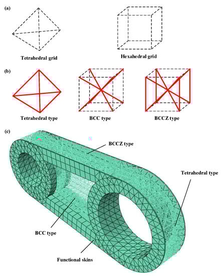 For spatial grids, the type of each grid is independent while ensuring that the grid is continuous and effectively fills the design domain. Furthermore, a variety of designs can be formed by filling various lattice cell configurations in different positions. Based on the method in Section 3.1, different grids (Figure 11a) can be used to design a variety of commonly used lattice cells. For example, a hexahedral grid can be designed as BCC or BCCZ cells, as shown in Figure 11b. Based on the method in this section, various and numerous lattice cells can form a continuous lattice structure based on spatial grids, as shown in Figure 11c.