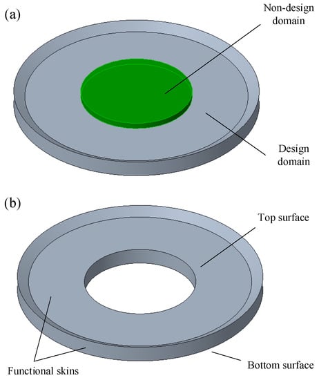 In this paper, the design object is a landing footpad for a lunar lander, the 3D model of the footpad is shown in Figure 12a. The center part of the footpad is attached to the landing leg and equipped with payloads such as sensors, therefore, it is not a design domain. The design domain of footpad is shown in Figure 12b, and all outer surfaces of the design domain are functional surfaces. A payload of 1 ton is attached to the top surface of the footpad. The footpad provides landing cushioning at a speed of 1 m/s in the vertical direction or 0.5 m/s in the horizontal direction. The landing ground is considered as rigid.