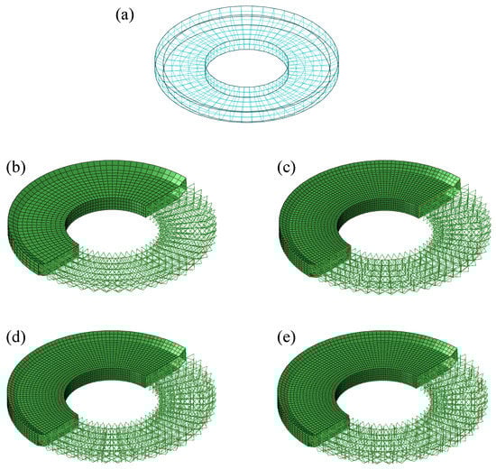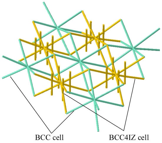 In this paper, four designs use the same spatial grid, as shown in Figure 13a. Four designs are presented for comparison, and they are named “D-BCC”, “D-BCCZ”, “D-BCC4IZ”, and “D-BIO”. Four designs are shown in Figure 13. “D-BCC”, “D-BCCZ”, and “D-BCC4IZ” filled the lattice configurations of BCC, BCCZ, and BCC4IZ in all spatial grids, respectively. “D-BIO” adopts the layout shown in Figure 8, and the BCC4IZ and BCC configurations are alternately filled in the spatial grid, as shown in Figure 14. All models are generated by the python automatic modeling script in ABAQUS software.