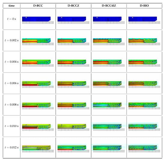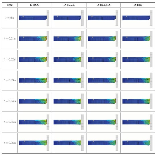 Rods in four designs are discretized into 3–6 elements according to the size of lattice, so as to ensure that the element size between the different models are approximately the same as . The total time and interval of the analysis are set to 0.05 s and 0.001 s, respectively. The calculation time for each simulation is about 2 h.