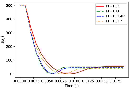 As listed in Table 4, the initial kinetic energy of the four designs are the same due to the fact that all the designs have the same total mass and the same initial velocity. The final D-BCC kinetic energy is slightly higher than other designs, and the final kinetic energy of the other designs are similar.
