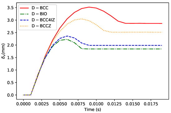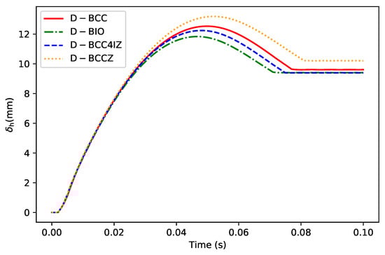 On the other hand, we further consider the deformation of the footpad during the cushioning process. The changing distance between the two points at top and bottom surfaces of the structure is used to measure the deformation in the vertical direction as . The time histories of for the four designs are shown in Figure 17 and the maximum and end values of them are listed in Table 5.