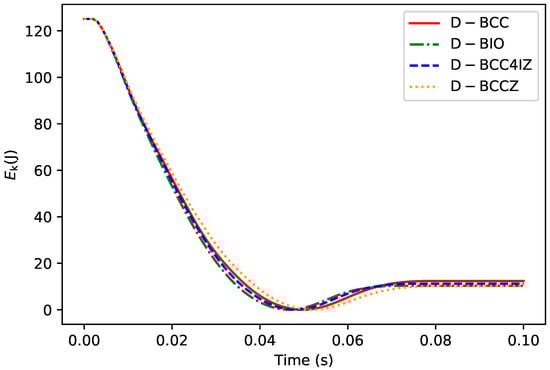 The results show that in the vertical landing condition, the cushioning process of different designs is generally similar and lasted about 0.01 s. After 0.012 s, each design begins to move vertically upwards. Meanwhile, the structure rebounded and the deformation decreased. In this paper, the kinetic energy changes before and after cushioning are concerned to evaluate the energy absorption performance of the different designs. The kinetic energy curves of the four designs are shown in Figure 16.