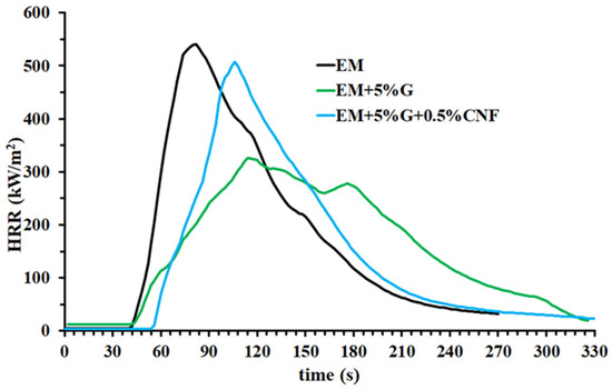 In particular, Figure 2 exhibits the heat release rate (HRR) curve with time of the sample EM + 5%G + 0.5%CNF by comparing it with both curves of the unfilled resin EM and of the resin filled with the flame-retardant molecule GPOSS (G), namely the EM + 5%G sample. There is no doubt that the flame-retardant behavior found for the multifunctional composite EM + 5%G + 0.5%CNF, for which the LOI value of 29 is recorded, is due to the presence of GPOSS. In fact, GPOSS has a structure fully epoxidized with glycidyl groups, which make it compatible with epoxy resin and reactive diluent. The addition of 5 wt% of GPOSS strongly affects the flammability of the resin, leading to a notable increase in LOI from 27% of the neat epoxy resin EM to 33% for the sample EM + 5%G containing GPOSS [19,20]. For the multifunctional sample EM + 5%G + 0.5%CNF, we can observe the decrease in PHRR value (~7%) and the increase in LOI value (~8%) with respect to the unfilled resin EM. Moreover, it must be said that a really noteworthy result is represented by the significant increase of 35% in the time-to-ignition discovered for the sample EM + 5%G + 0.5%CNF (54 s) with respect to the unfilled resin EM (40 s) and even 29% compared to the sample EM + 5%G (42 s) containing GPOSS. Thus, the multifunctional nanocomposite EM + 5%G + 0.5%CNF shows the highest value of the time-to-ignition compared to that found for all other formulations analyzed in this work, playing a crucial role in perspective for all those applications in the aeronautical sector that require advanced materials that act as flame retardants, as well as having synergistic structural and functional capabilities also imparted by the use of conductive nanofillers.