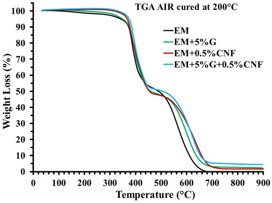The thermal behavior of the formulated epoxy samples was investigated by using thermogravimetric analysis (TGA). Figure 3 and Figure 4 show the TGA curves in air and in inert (N2) atmosphere of the samples EM, EM + 5%G, EM + 0.5%CNF, and EM + 0.5%CNF + 5%G, respectively.