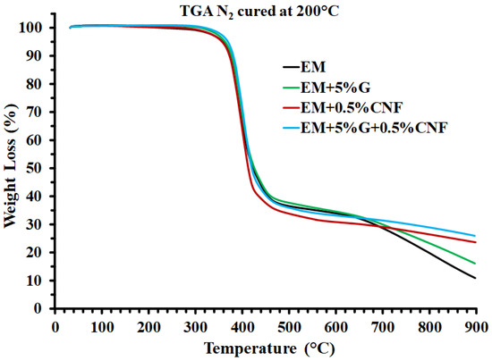 From TGA in air (Figure 3), it can be seen that the nanofilled formulations are more thermostable than the EM unfilled epoxy matrix and the thermostability increases progressively for both the weight loss steps in passing from sample EM + 5%G to multifunctional nanocomposite EM + 0.5%CNF + 5%G, which exhibits the greatest stability to oxidative thermal degradation (see Table 3). In particular, TGA curves in the air highlight that, compared with the unfilled sample EM, the multifunctional epoxy resin EM + 0.5%CNF + 5%G shows a substantial increase in the thermal stability related to both the first and second stage of the degradation process. This increase, on the other hand, appears less pronounced in nitrogen (see Figure 4), especially in the first stage. Moreover, we can observe two distinctive and well-separated turns also for TGA curves in nitrogen.
