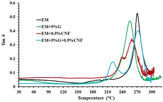 From Figure 5, for the multifunctional nanocomposite EM + 0.5%CNF + 5%G, we can clearly observe an increase in the storage modulus across the wide temperature range between 30 °C and 255 °C compared to the other analyzed samples while maintaining the same trend. It is well-known that the POSS molecule is characterized by an inorganic rigid cage type structure (RSiO1.5) containing silicon and oxygen and organic groups attached to the silicon atoms [36]. The slight reinforcement effect manifested by GPOSS, in the range of temperature between 60 °C and 150 °C, with respect to the resin alone, can be explained in consideration of the fact that when the GPOSS is solubilized at the molecular level inside the epoxy matrix, the rigid silica cage determines the hardening of the resin also by virtue of the fact that the number of polyadditions increases due to the organic functionality identified by the glycidyl groups present on the GPOSS molecule. The strong increase in the storage modulus values determined by the combination of CNFs and GPOSS is most likely due to additional attractive interactions, based on hydrogen bonds, between -OH groups present on the wall of CNFs [31] and the oxygen atoms on the organic groups attached to the silicon atoms around the rigid nanocage of the POSS. Figure 6 presents the loss factor (tan δ) of the investigated epoxy formulations.